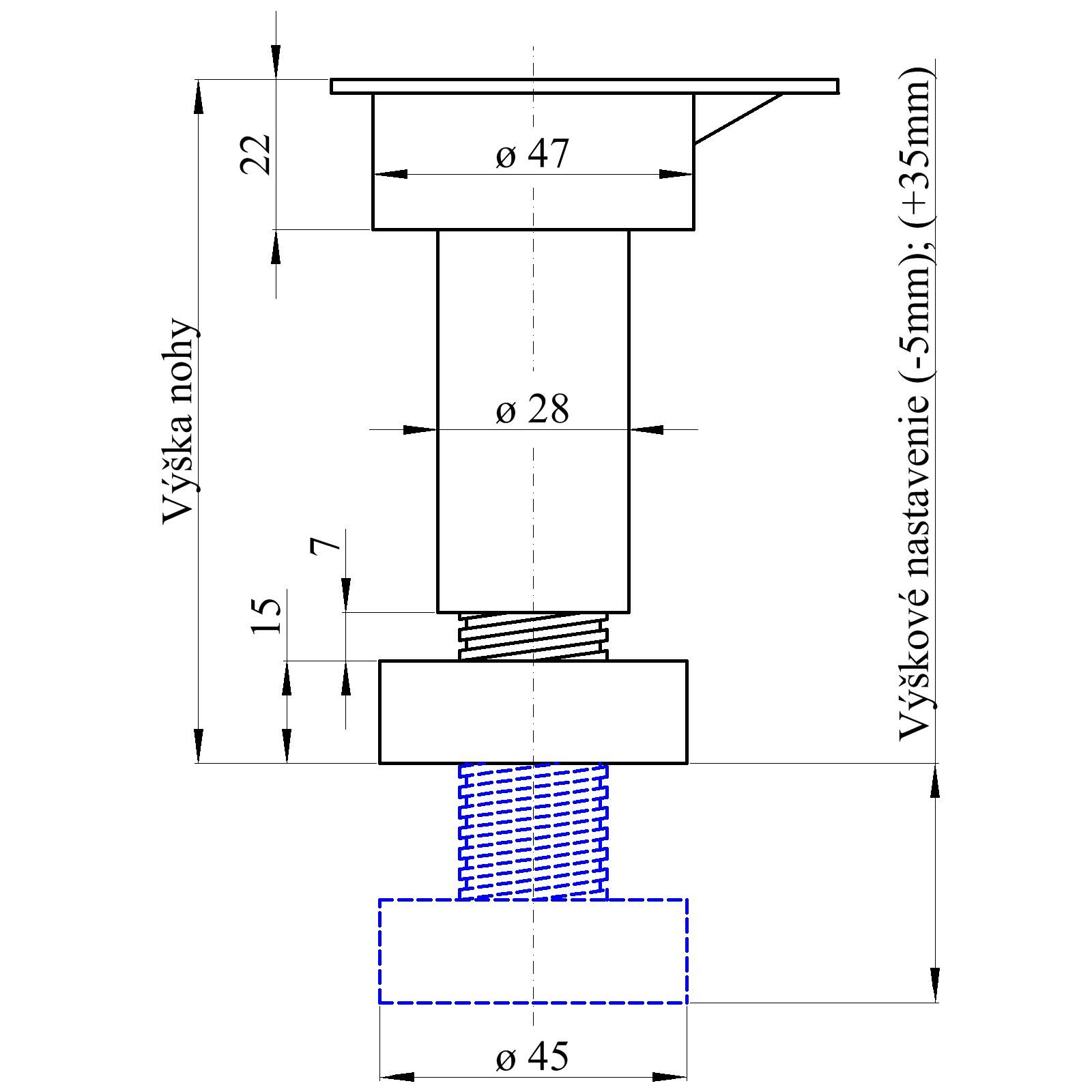 Rektifikačná noha R5 - Rozoberatelná - Prevedenie plast - Plynulé nastavenie výšky v rozmedzí 100-120 mm - Uchytenie 4x drevoskrutka, alebo 1x skrutka M10 (nieje obsahom balenia)
