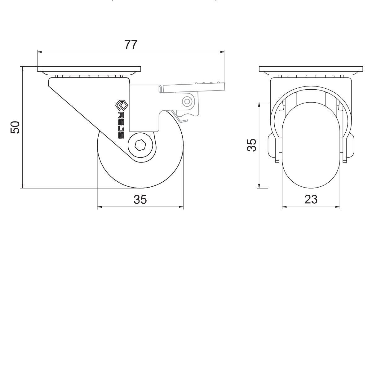 35 mm otočné nábytkové koliesko s brzdou. Plášte kolies sú vyrobené z kvalitného materiálu, ktorý nepoškodzuje povrch podláh a otočná, nosná oceľová konštrukcia poskytuje nosnosť 30 kilogramov.