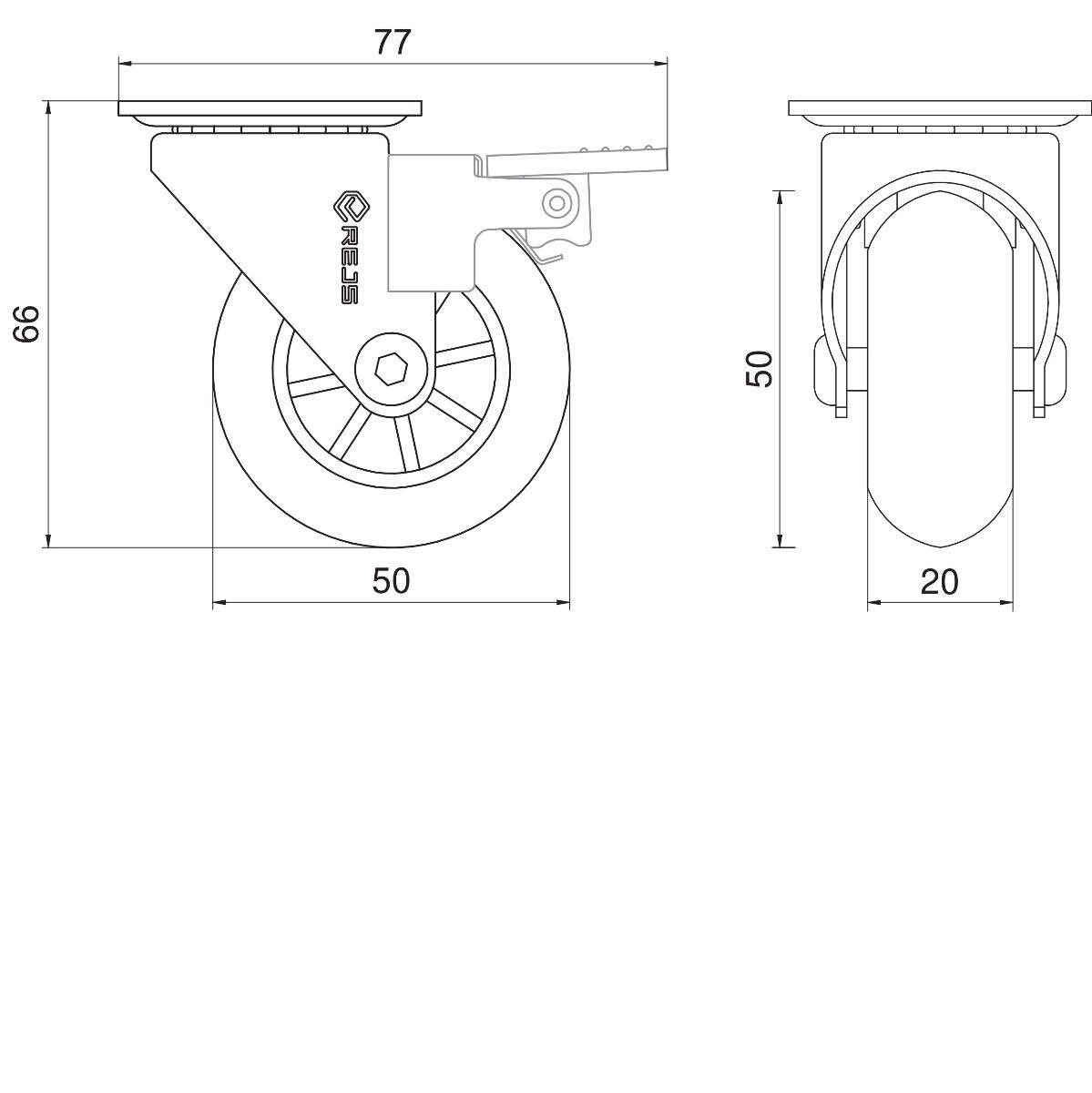 50 mm otočné nábytkové koleso s brzdou. Plášte kolies sú vyrobené z kvalitného materiálu, ktorý nepoškodzuje povrch podláh a otočná, nosná oceľová konštrukcia poskytuje nosnosť 40 kilogramov.