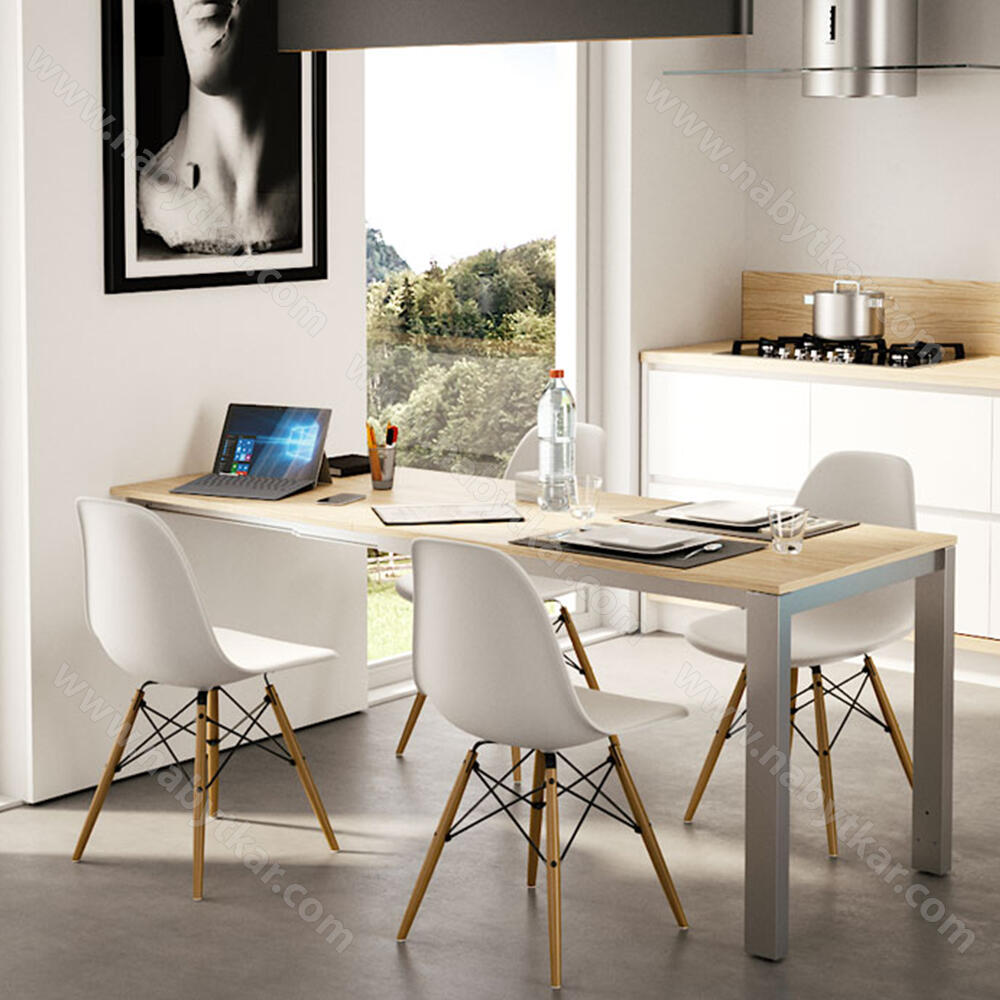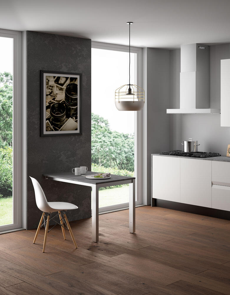 S hliníkovou mostovou nohou nastaviteľnou na výšku od 710 mm do 735 mm možno Voilà Chair Reverse upevniť na stenu alebo na bok/zadnú stranu ostrovčeka. Jeho výklopná doska zdvojnásobí dĺžku stola, takže sa okolo neho ľahko zmestí viac stoličiek. Dvojité nohy navyše zaručujú vysokú stabilitu s nosnosťou až do 100 kg.