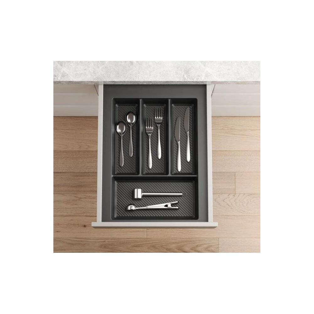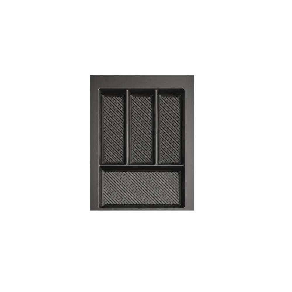 Organizér na príbory do zásuvky s vonkajšou šírkou 40 cm Prevedenie: antracit Šírka: 290 – 350 mm Hĺbka: 422 – 490 mm Výška: 55 mm Príborník je k dispozícii v 7 rozmeroch. Okraje príborníka je možné svojpomocne skrátiť na šírku aj hĺbku, aby dokonale pasoval do zásuvky s neštandardnými rozmermi. Vysokokvalitný plast s hrúbkou 2 mm so špeciálnou rebrovanou štruktúrou zaručuje výnimočnú odolnosť a trvanlivosť. Drážky na dne príborníka navyše eliminujú pohyb predmetov pri manipulácii so zásuvkou a uľahčujú uchopenie menších predmetov. Praktické rozvrhnutie priehradiek umožňuje efektívnu organizáciu príborov a maximálne využitie priestoru v zásuvke.