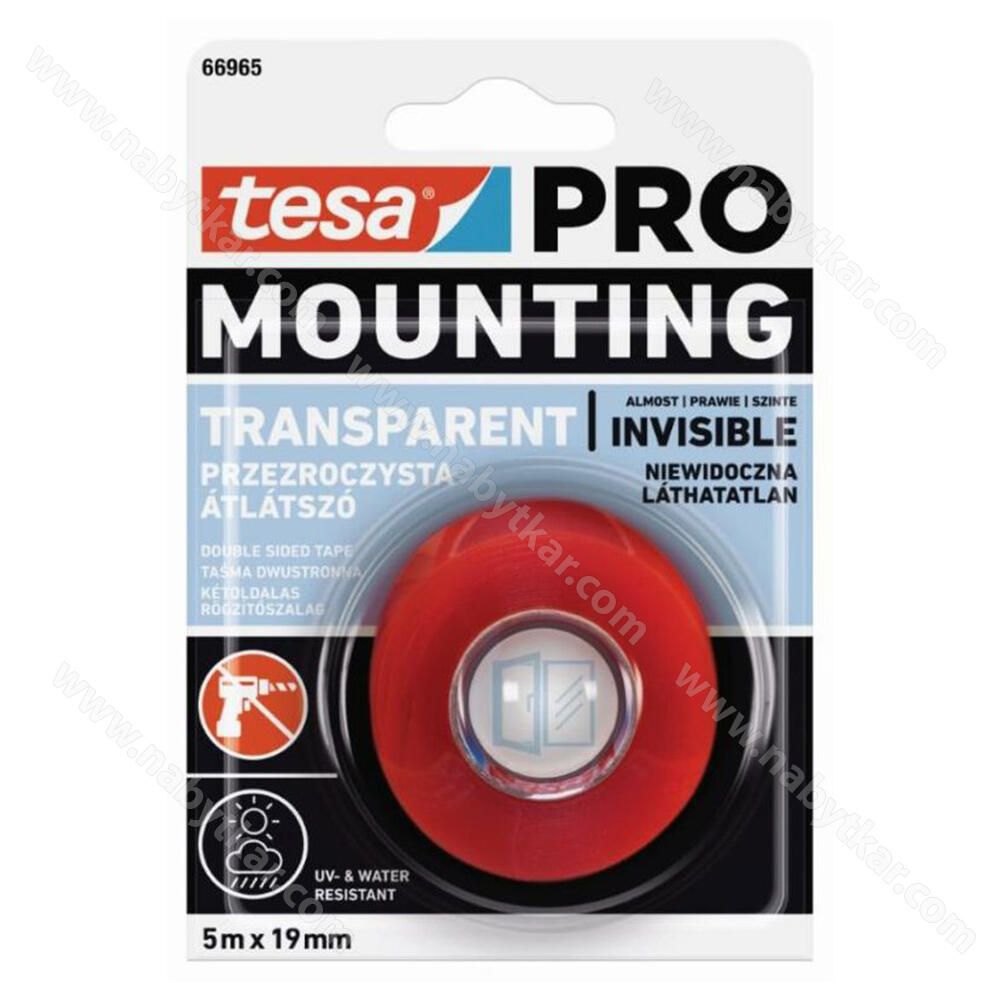 • tesa PRO Mounting Transparent je trvanlivá, priesvitná a tenučká lepiaca montážna páska, obojstranná – výborne sa hodí pre využitie vo vnútri aj vonku
